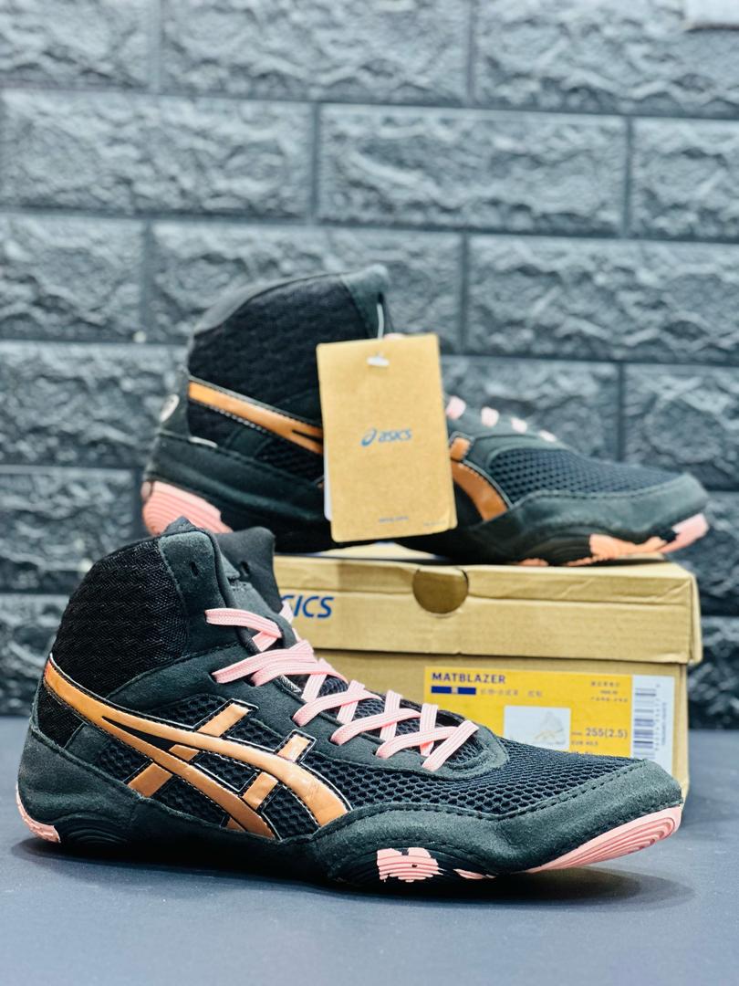 ASICS MATBLAZER Wrestling Shoesکفش مناسب برای این ورزش نیم بوت های سبک و بدون پاشنه است. برای اجرای مناسب حرکات این کفش باید از انعطاف پذیری، قدرت و استقامت بالایی برخوردار باشد، همچنین با توجه به براق و لیز بودن کف پوش تشک کشتی باید در ته کفش عاج مناسب برای اصطحکاک ، مطلوب باشد. قسمت زیر کفش نیز باید ابری نازک وجود داشته باشد و برای محافظت هرچه بیشتر از مچ پا در هنگام اجرای حرکات ، این نوع کفش ها دارای ساقی مناسب هستند. کفش های کشتی دارای برندها و کیفیت های گوناگونی می باشد و شرکت آدیداس یکی از معتبرترین شرکت تولید کننده کفش ورزشی بوده.